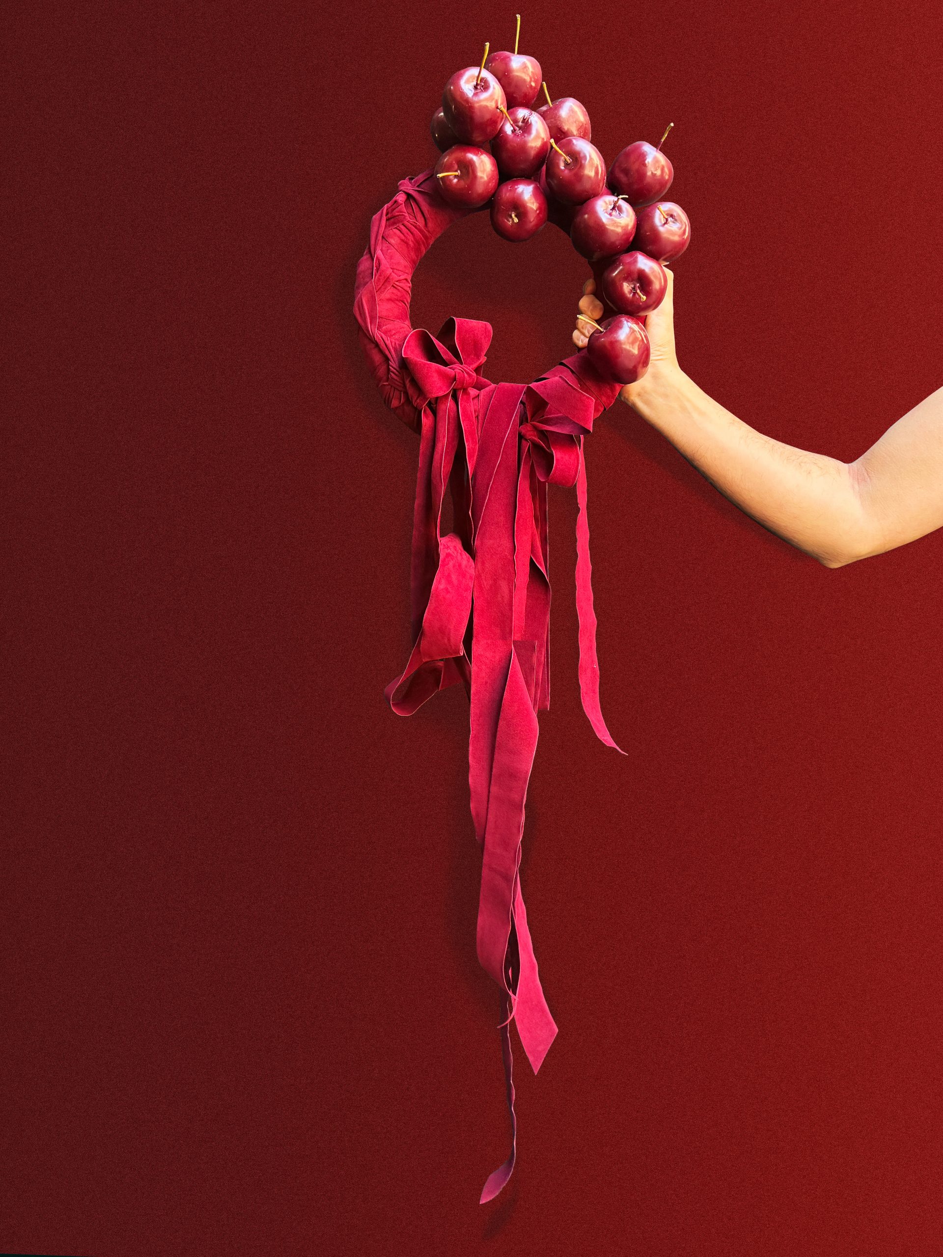 - Materiales: Manzanas enceradas cuidadosamente seleccionadas y lazos de satén rojo.