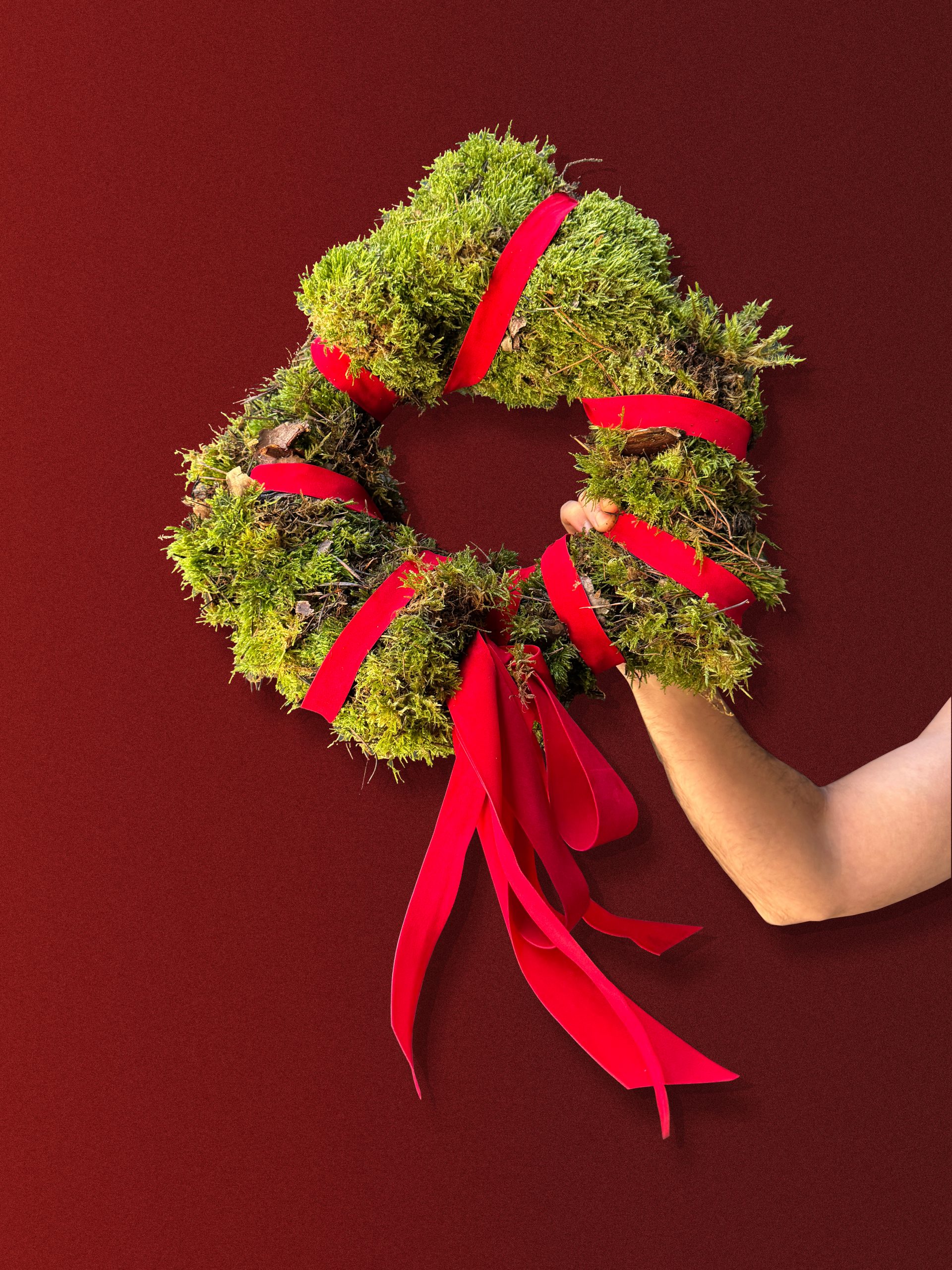- Materiales: Musgo verde fresco y lazos de terciopelo rojo.