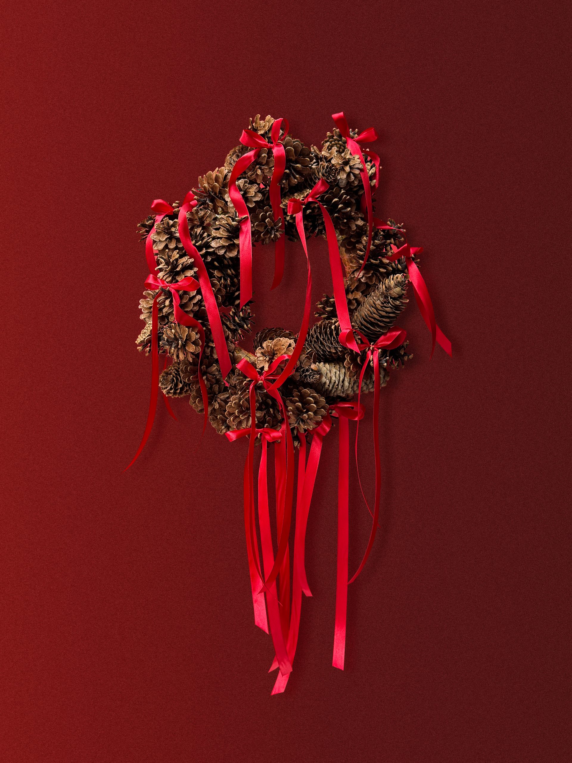 - Materiales: Piñas naturales cuidadosamente seleccionadas y lazos de satén rojo.