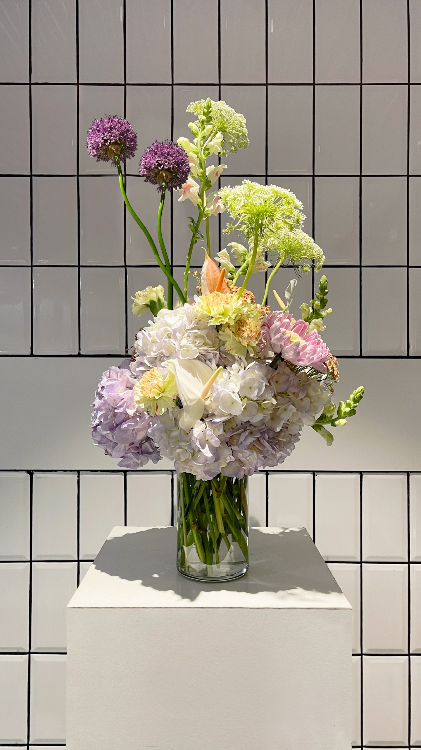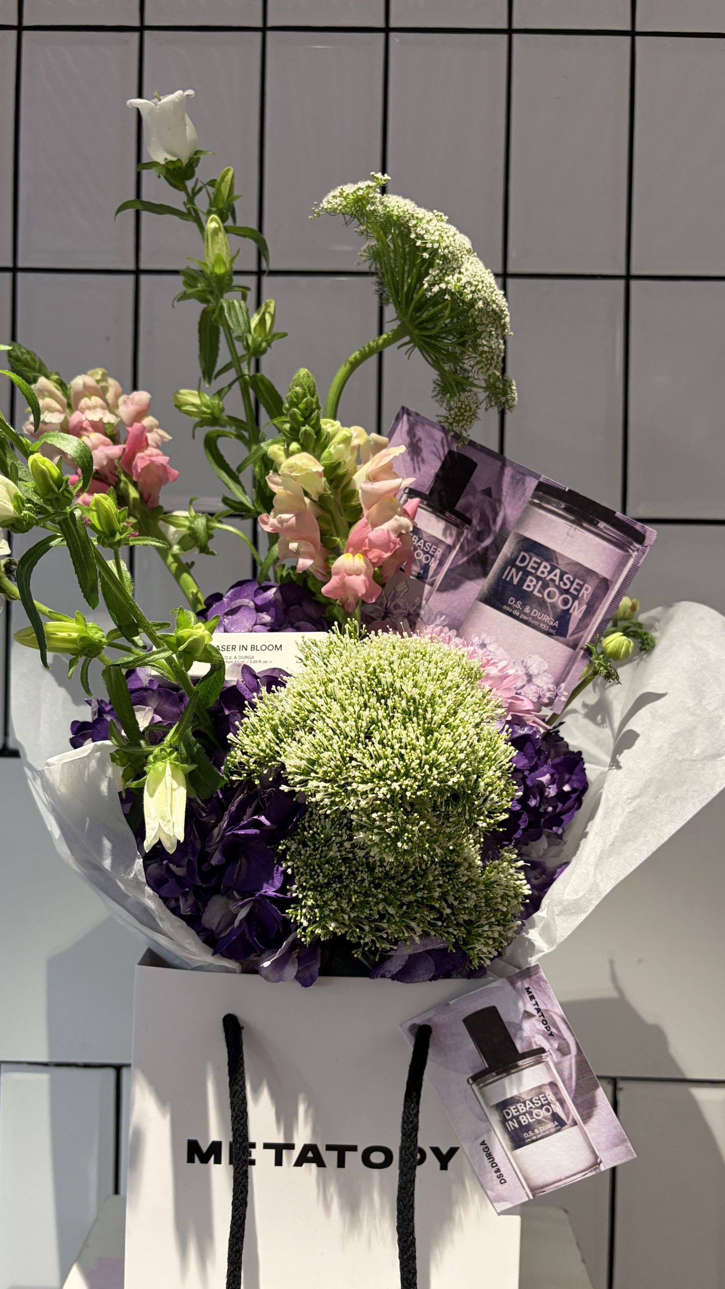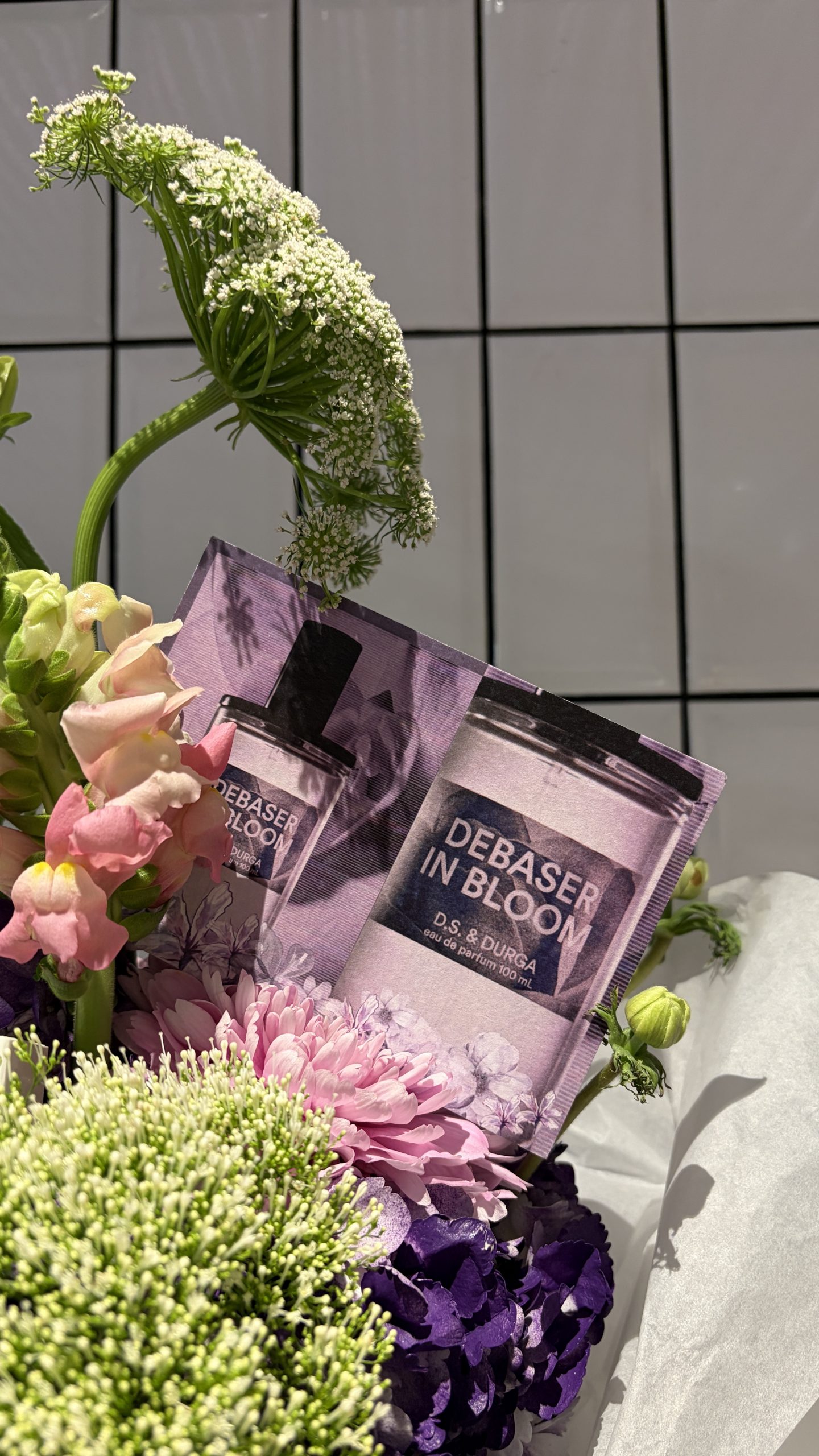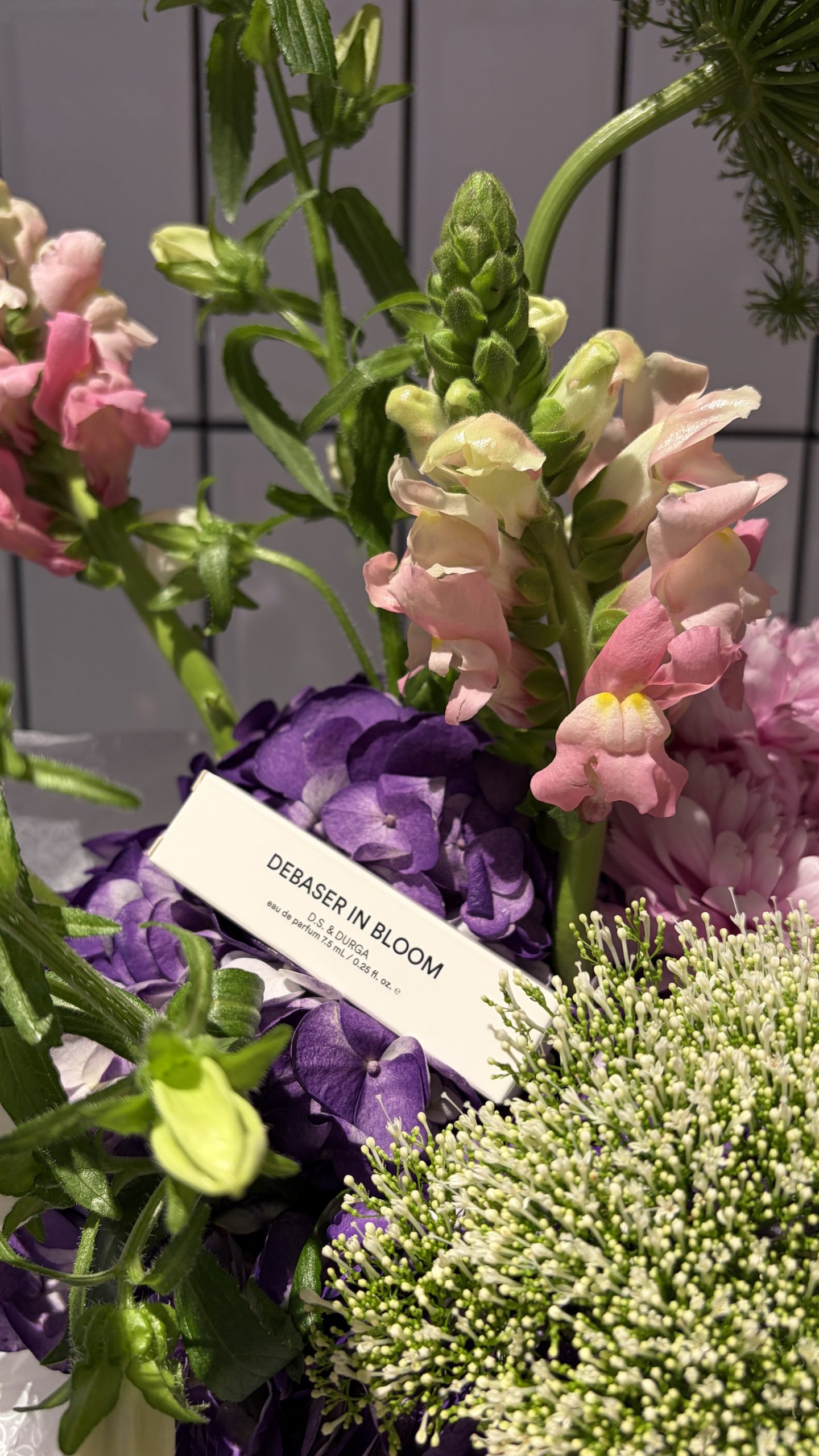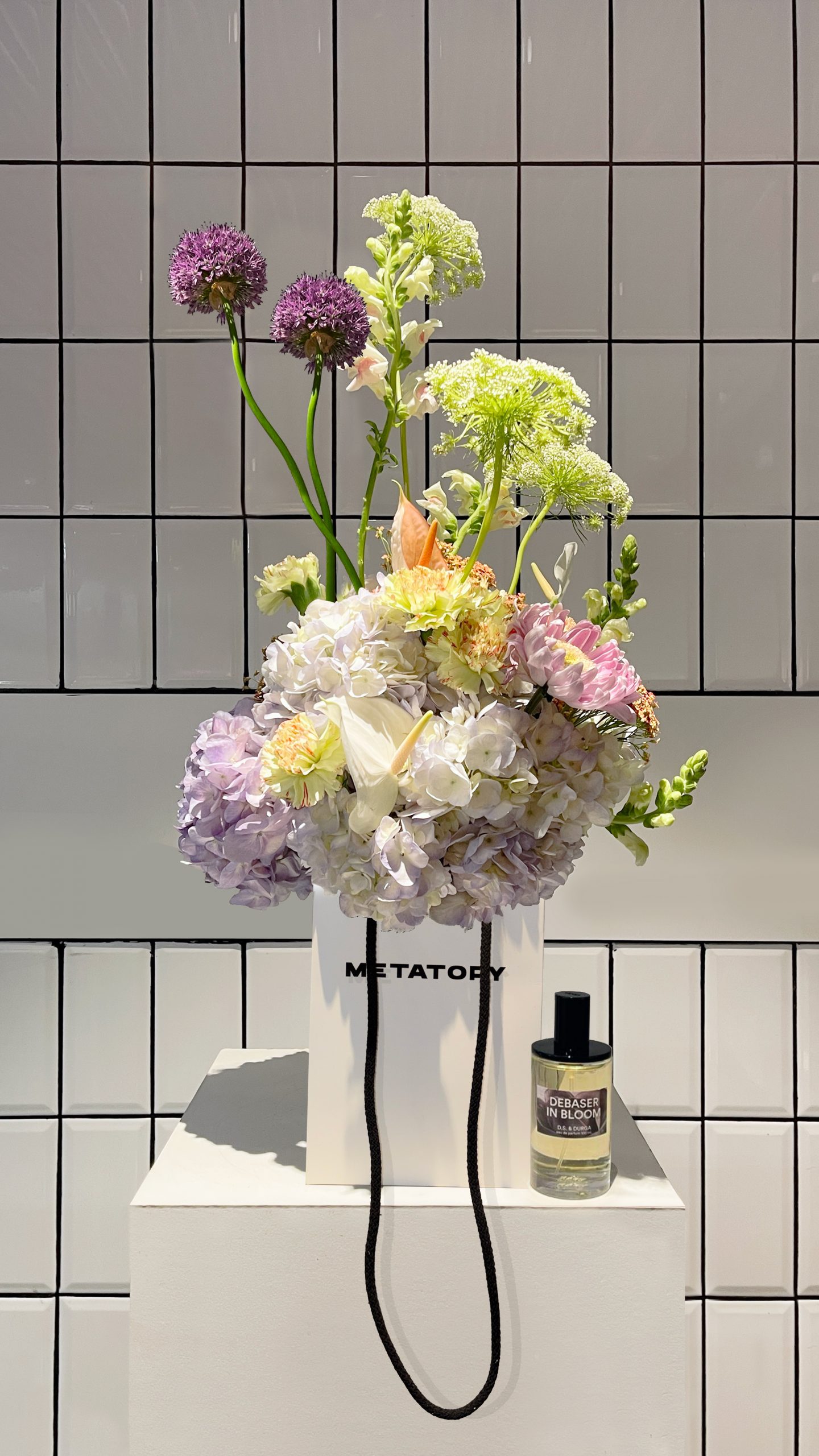 hortensia morada, allium, dragonaria, crisantemos en tonos rosados y ammi majus, entre otras variedades, creando una paleta vibrante y delicada que evoca la personalidad del perfume: floral, verde y ligeramente salvaje.